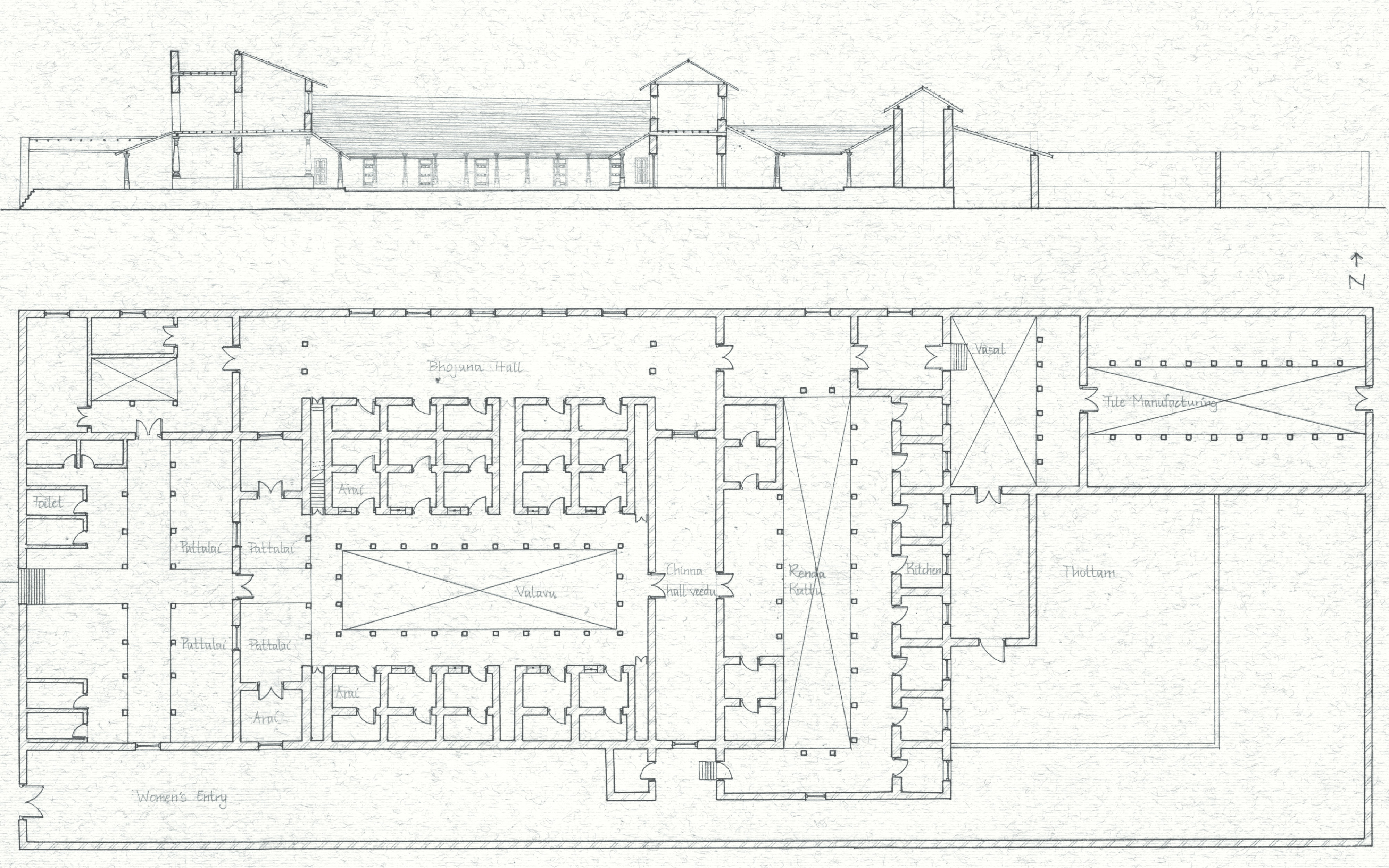 A week-long measured drawing and ethnographic study was undertaken in Athangudi, a Chettinad village renowned for its palatial houses, Athangudi tiles, and intricate timber work. Through participatory discussions with residents, we traced settlement patterns shaped by various communities, documenting their architecture, crafts, and socio-cultural practices. Climatic data, soil conditions, and water systems were also recorded to contextualize material choices. The findings were synthesized into panels supported by scaled drawings, analytical diagrams, and sketches, capturing both tangible details of construction and the intangible cultural narratives that sustain Athangudi’s unique architectural and social fabric.