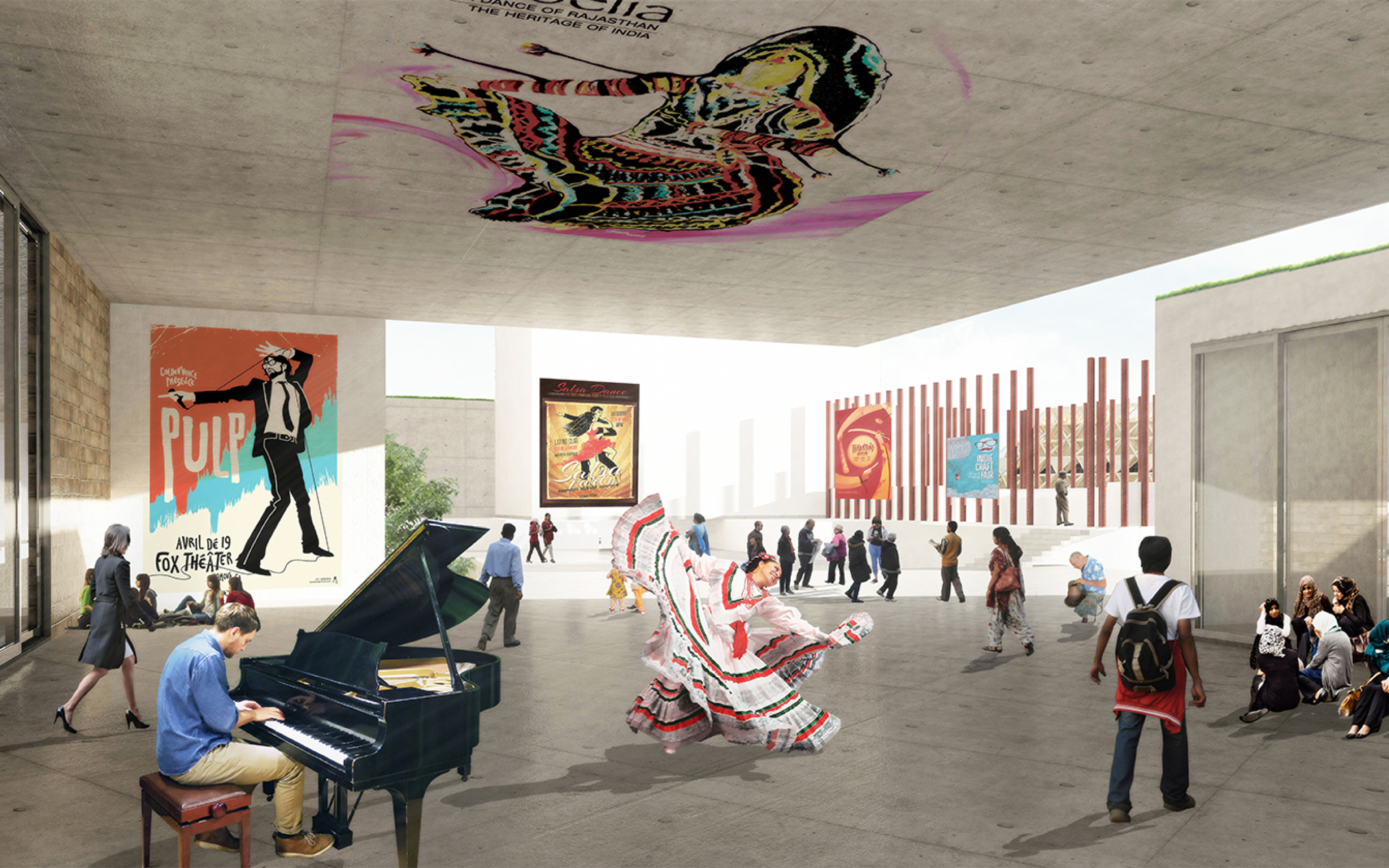 This project reimagines Delhi’s Pragati Maidan as a civic stage where culture, performance, and architecture converge. Drawing from India’s traditions of music, dance, and drama, the design choreographs movement through voids that serve as atria, pause points, and adaptive venues shaped by light and shadow. These voids stitch interior and exterior spaces into a continuum of people, pace, and place. Structurally framed by concrete cores and steel spans, the center integrates passive cooling stacks, photovoltaic roofs, double-skin façades, and rainwater harvesting. Architecture becomes both backdrop and performer, sustaining timeless cultural expression through evolving spatial choreography and ecological responsiveness.